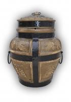 Тандыр БАРЕЛЬЕФ Средний электрический сразу в нескольких местах оснащен коваными элементами для большей надежности. Удобные металлические ручки позволяют переносить даже нагретый тандыр. Симпатичное глиняное сооружение, долго удерживающее тепло, имеет лаконичный декор в виде головы оленя. Керамический сосуд продается в такой комплектации: собственно сам тандыр с металлической поковкой, большая и малая крышки, внутри имеется защитная сетка и электрическая спираль. Ознакомившись с прилагаемой к изделию инструкции, остается только подключить электрический шнур к сети электропитания. Миска для сбора жира позволит содержать изделие в чистоте, удаляя все лишнее после готовки. Модель имеет такие технические характеристики: высота – 67 см, диаметр – 45 см, вес изделия 40-45 см при толщине стенок 3-4 см. Диаметр горловины составляет 25-26 см при мощности 1.5 кВт.